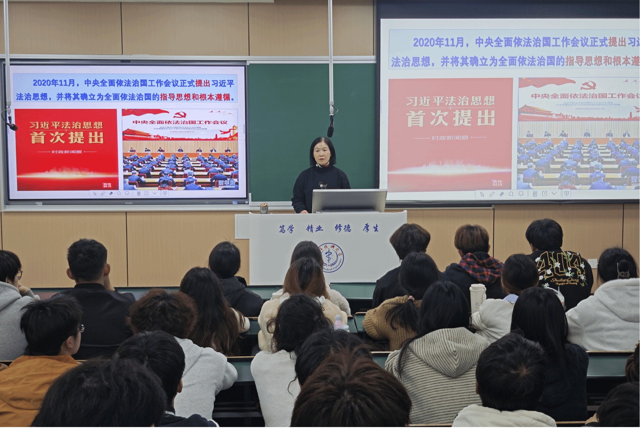 讲座中,武余芹围绕习近平法治思想的形成与发展、主要内容以及提升大学生法治素养三部分内容,系统阐释了全面依法治国的重大意义与科学内涵;引导同学们将法治思维融入学习与生活,恪守行为底线,切实提升自身法治素养。